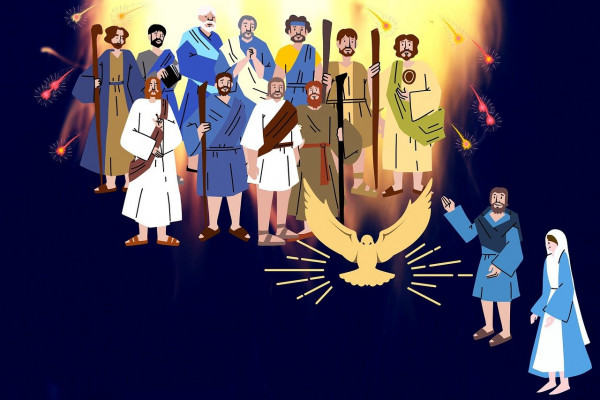 예수님의 모든 제자들이 하나님의 일하심을 지금 기다리며 마가의 다락방에 모여서 전혀 기도에 힘쓰고 있습니다.